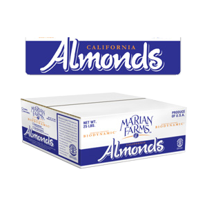 Marian Farms is the only producer of Demeter-certified Biodynamic® almonds in North America. Our Biodynamic® farming practices and special pasteurizing methods preserve the life forces in the almonds. Pasteurization of almonds is required by law. We use flash pasteurization, which only allows steam to touch the almonds for three seconds, and we do not roast the almonds. This preserves their living quality. They are still able to sprout and retain their enzymes and vitamins. Almonds are a great source of protein and fiber and high in Vitamin E, biotin, calcium, magnesium and unsaturated fats, making them an excellent heart-healthy snack. Our organic almonds are free from chemical residues sometimes found in conventionally-grown and processed almonds. Our methods result in crisp almonds with a complex flavor profile and a superior shelf life. We are pleased to offer two almond varieties: Nonpareil and Carmel. Nonpareil, sometimes called the “Queen of almonds”, have a delicate, sweet flavor and are commonly used in baking. Carmel almonds have a bolder, Amaretto-type flavor.